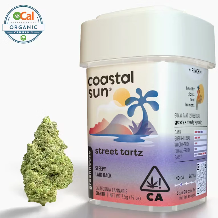 Sweet Tartz is a genetic cross of Guava Tart and Street Guru. It offers a unique, gassy, and musty aromatic profile with subtle hints of baked pastries. When consumed, users note this cultivar induces a mellow calmness that gradually deepens into a profoundly cozy state, potentially helpful in supporting a restful sleep session.