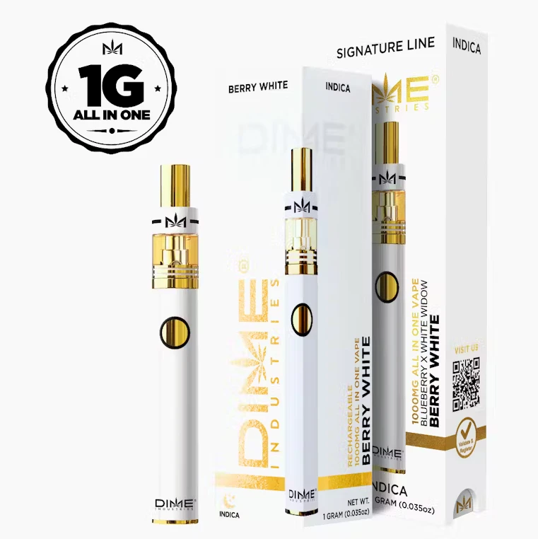 Elevate your experience with DIME - Disposable Vape - Signature Line - Indica - Berry White (1g). This premium cartridge features a legendary hybrid crafted from Blueberry and White Widow. Berry White offers a unique blend of sour berry and earthy pine, delivering a refreshingly crisp taste that balances nostalgia with innovation. Powered by Dime's cutting-edge hardware, enjoy three customizable heat settings (4.2v to 3.2v), a pre-heat function, easy airflow, and USB-C rechargeability. Relish the euphoric effects that leave you talkative and hungry, thanks to the rich terpene profile of limonene, pinene, and humulene. Treat yourself to an unparalleled vaping sensation with the industry's most powerful battery in this remarkable disposable vape.