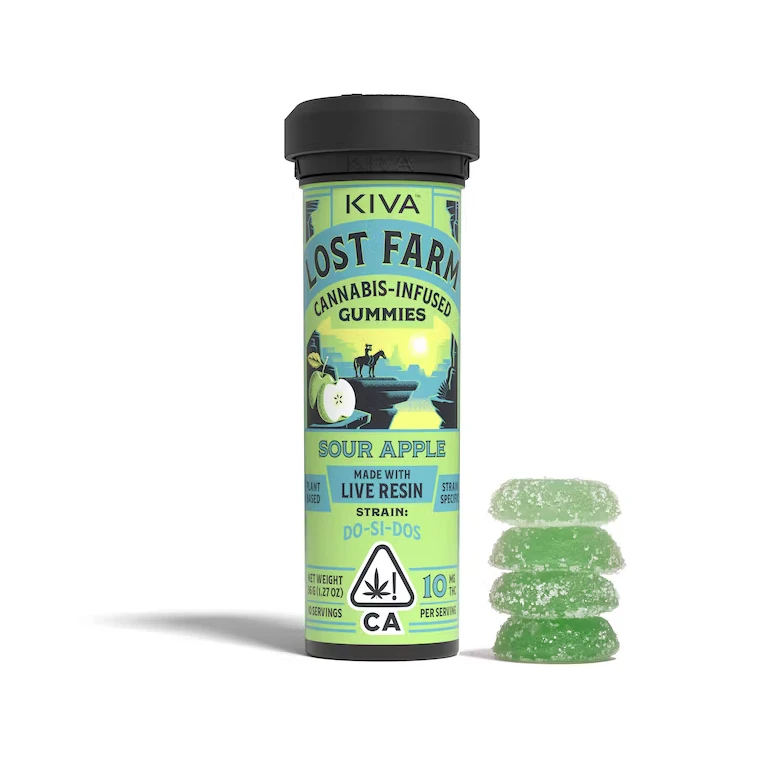 Introducing Kiva Confections' Lost Farm Indica Sour Apple Live Resin Gummies. This 10-pack of edibles, each containing 100mg THC, offers a uniquely delicious experience. The sweet, doughy, and nutty notes of the indica-dominant Do-Si-Dos strain perfectly complement the juicy, refreshingly tart flavor of green apple. Crafted with "live resin," these plant-based gummies preserve the rich flavors, complex aromas, and broad terpene profiles of freshly-harvested cannabis flowers. Ingredients include sugar, tapioca syrup, water, pectin, citric acid, green apple flavor WONF, sodium citrate, cannabis extract, fruit and vegetable juice for color, and spirulina extract for color. Allergy Warning: Contains soy. Enjoy a mellow and flavorful journey with every bite!