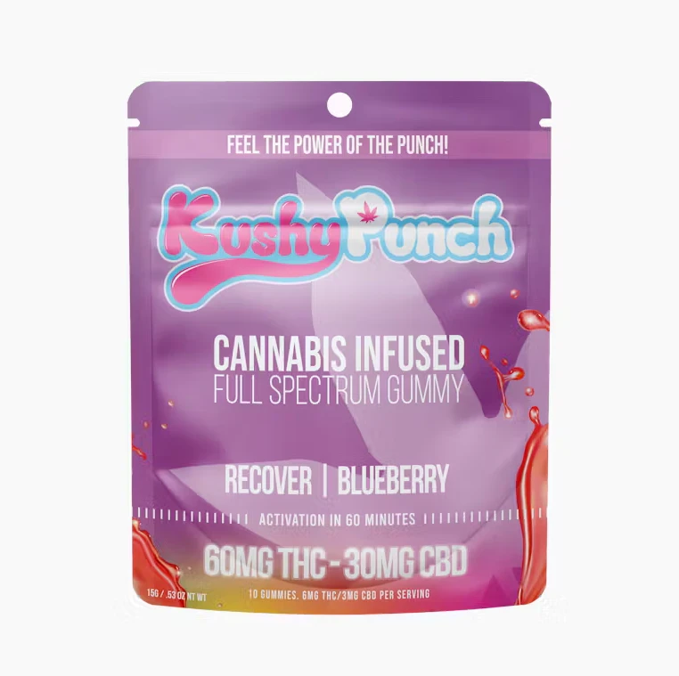 KushyPunch’s Recover gummy gives you 60mg of THC with 30mg of CBD, keeping the comfort levels high and stress levels low. This delicious black and blueberry gummy soothes and heals after a long day.