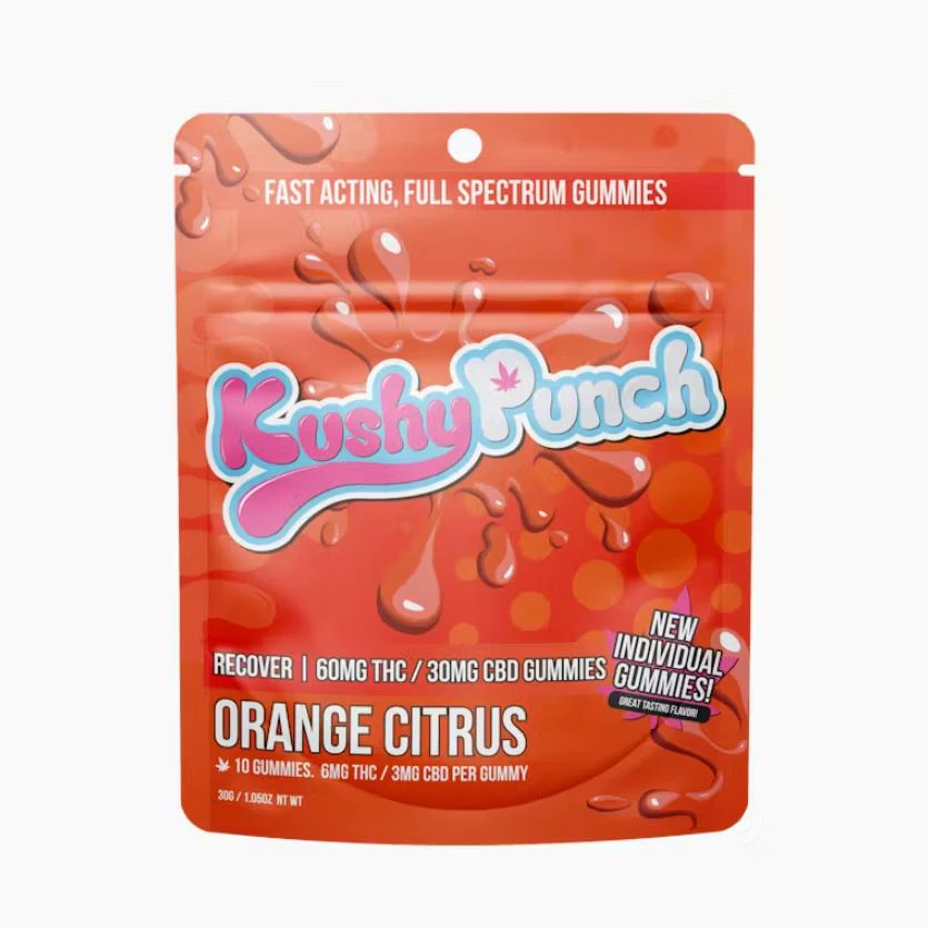 Introducing Kushy Punch - Hybrid - 2:1 Orange Citrus - Individual Gummies, a premium edible by the renowned brand Kushy Punch. Each pack contains 10 delectable gummies, expertly crafted with a balanced blend of 60mg THC and 30mg CBD, ideal for those seeking a harmonious experience. The refreshing orange citrus flavor tantalizes your taste buds while delivering the benefits of full-spectrum oil. Designed for rapid onset, these gummies offer fast activation to ensure you feel the effects promptly. Whether you're looking to recover or simply enjoy a balanced high, these 2:1 THC/CBD gummies are your perfect companion. Enjoy the synergy of cannabinoids with Kushy Punch's commitment to quality and consistency in every bite.