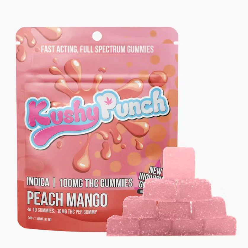 Indulge in the soothing effects of Kushy Punch's Indica Peach Mango Individual Gummies, a premium edible from the renowned brand Kushy Punch. Each gummy is expertly crafted to deliver a potent 100mg dose of high-quality Indica, perfect for unwinding after a long day. The delightful peach mango flavor adds a tropical twist to your cannabis experience, making it both enjoyable and effective. Whether you're seeking relief from stress, pain, or simply looking to relax, these gummies offer a discreet and delicious way to consume your cannabis. Trust in Kushy Punch for consistent quality and potency in every bite.