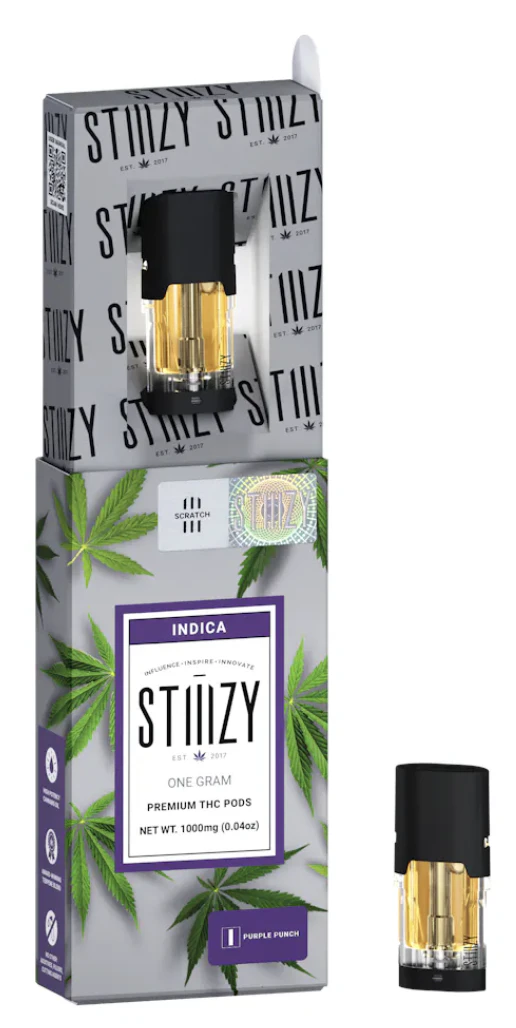 Stiiizy - Full Gram Pod - Indica - Purple Punch - Tropical Punch Flavor (1g) is a premium cartridge from the renowned brand Stiiizy. This indica-dominant strain, a delightful cross between Larry OG and Granddaddy Purp, offers a tantalizing taste profile of grape, berry, and sweet notes. Users can expect to feel relaxed, happy, euphoric, sleepy, and uplifted. Purple Punch is celebrated for its ability to provide relief from stress, pain, depression, and insomnia. Enjoy the soothing effects of this expertly crafted product designed to enhance your well-being with every puff.