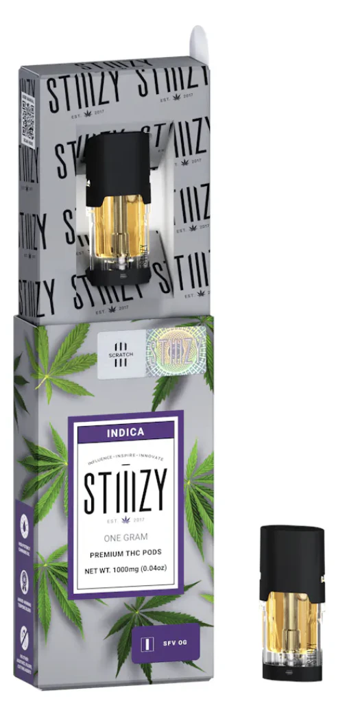Stiiizy Full Gram Pod - Indica - SFV OG (1g) is a premium cartridge from the renowned brand Stiiizy. This pure indica strain delivers a gradual, full-body relaxation that begins in the head and slowly eases its way down, effectively numbing pain along its path. Users often experience a heavy, sedative effect, so be mindful of potential couchlock. SFV OG is particularly beneficial for alleviating stress, depression, pain, insomnia, and lack of appetite. Crafted with the highest standards in mind, this product contains no PG/PEG/VG, no MCTs, no cuts or fillers, and no solvents. Enjoy a pure and potent cannabis experience with every puff.