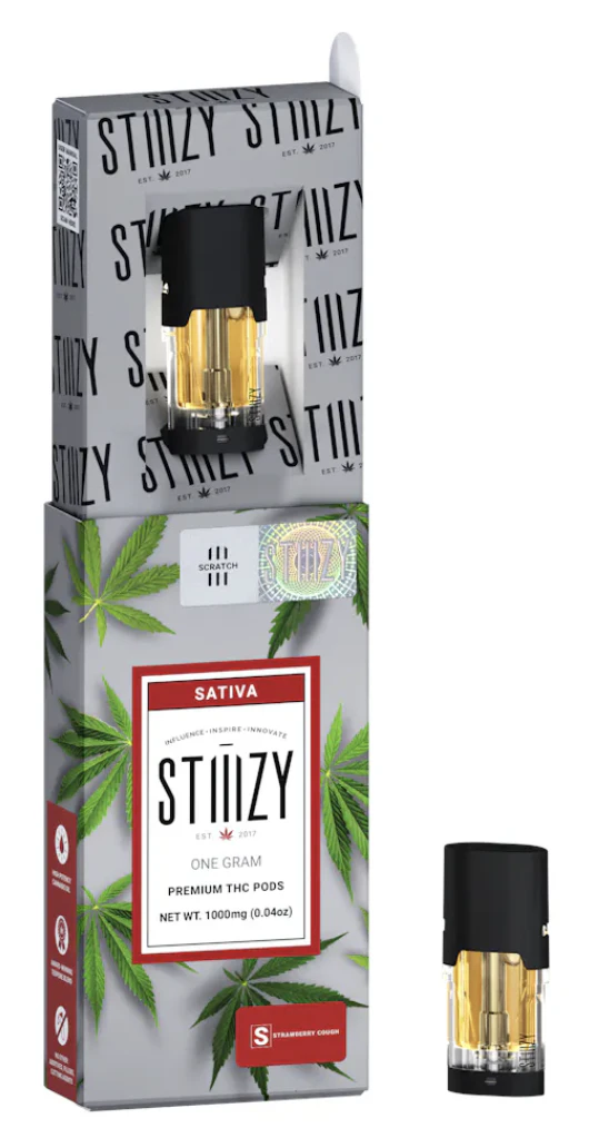 Stiiizy's Full Gram Pod - Sativa - Strawberry Cough (1g) offers a delightful strawberry flavor, derived from the cross between Strawberry Field and Haze. This potent strain delivers a thoughtful and energetic high, making it perfect for engaging conversations, reading, or working. Ideal for alleviating stress, depression, pain, fatigue, and headaches, this cartridge ensures a clean experience with no PG/PEG/VG, MCTs, cuts or fillers, and solvents. Enjoy the pure essence of cannabis with Stiiizy's premium offering in the Strawberry Cough variety.