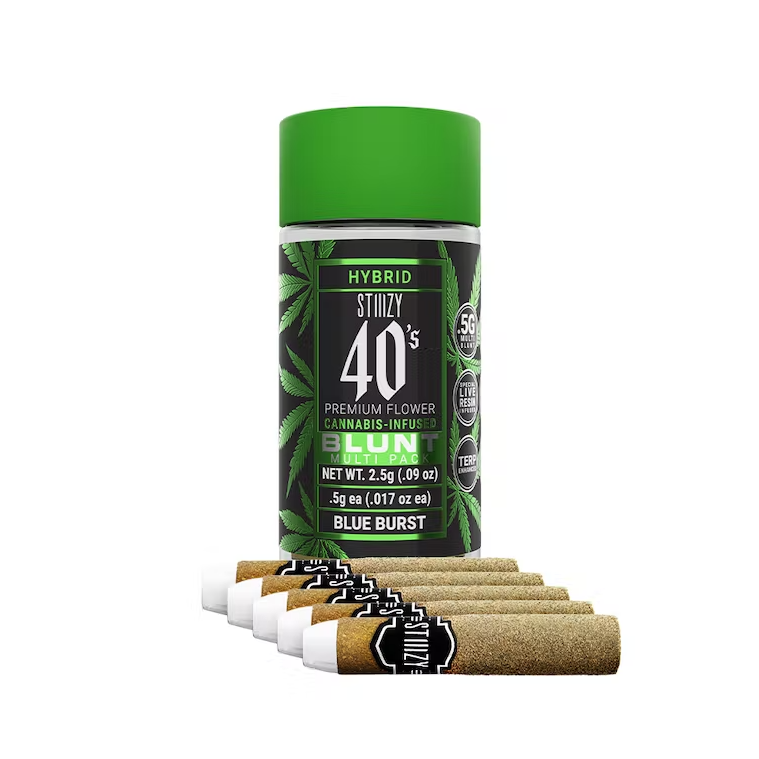 STIIIZY 40’s Mini Blunts Multipack is filled with premium grown STIIIZY cannabis and packed in individual glass vials to maintain freshness and potency. Each 40’s Mini Blunt is rolled with 100% tobacco free, kief dusted hemp wraps which packs a flavorful and potent punch with every exhale, and the tightly secured custom glass tips have been perfected to provide an amazing and consistent burn every time. The STIIIZY 40’s Mini Blunts Multipack is reinventing your high experience by being one of the first to introduce 40% THC and total cannabinoids potency with special live resin infusion.