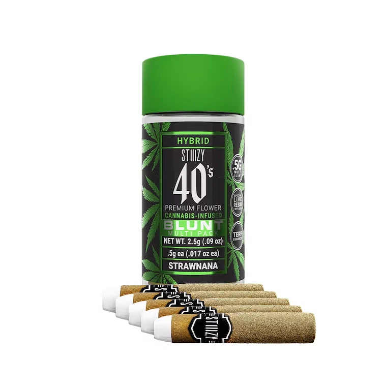Introducing the Stiiizy Mini Blunts Pack - Infused 40's - Hybrid - Strawnana (2.5g total) 5 Pack, a premium offering from the renowned Stiiizy brand. Each mini blunt is crafted with top-quality STIIIZY cannabis and individually packed in glass vials to ensure maximum freshness and potency. Rolled with 100% tobacco-free, kief-dusted hemp wraps, these blunts deliver a flavorful and potent experience with every exhale. The custom glass tips are designed for a consistent and smooth burn every time. Elevate your high with the innovative 40% THC and total cannabinoids potency, enhanced by special live resin infusion. Perfect for those seeking a superior preroll experience, this multipack is set to redefine your cannabis enjoyment.