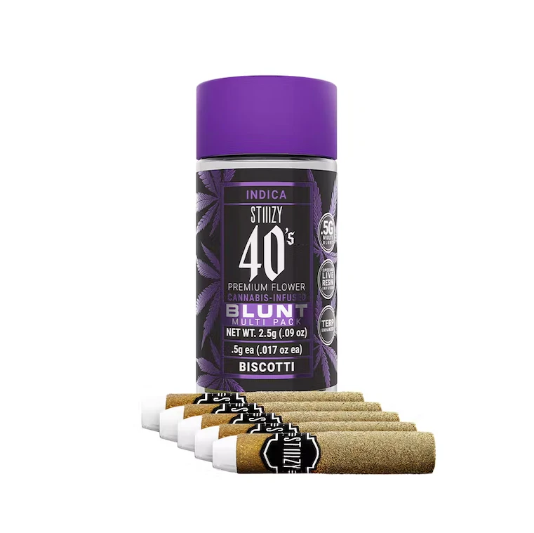 Introducing the STIIIZY Mini Blunts Pack - Infused 40's - Indica - Biscotti (2.5g total) 5 Pack, a premium preroll product from the renowned brand STIIIZY. This multipack features expertly grown STIIIZY cannabis, meticulously packed in individual glass vials to ensure maximum freshness and potency. Each mini blunt is rolled with 100% tobacco-free, kief-dusted hemp wraps, delivering a flavorful and potent punch with every exhale. The custom glass tips are designed for an exceptional and consistent burn every time. Revolutionizing your high experience, these mini blunts boast an impressive 40% THC and total cannabinoids potency, enhanced with special live resin infusion. Elevate your cannabis experience with this innovative offering from STIIIZY.