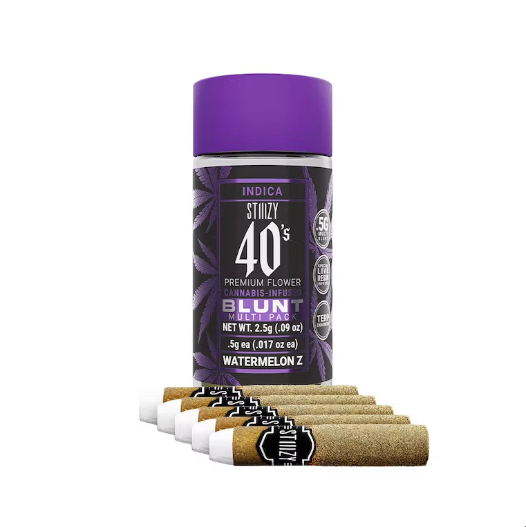 Introducing the Stiiizy Mini Blunts Pack - Infused 40's - Indica - Watermelon Z (2.5g total, 5 Pack), an exceptional product in the Preroll category by Stiiizy. These mini blunts are crafted from premium-grown Stiiizy cannabis and meticulously packed in individual glass vials to preserve freshness and potency. Each blunt is rolled with 100% tobacco-free, kief-dusted hemp wraps that deliver a flavorful and potent punch with every exhale. Featuring custom glass tips designed for an amazing and consistent burn, the Stiiizy Mini Blunts redefine your high experience, boasting an impressive 40% THC and total cannabinoid potency through special live resin infusion.