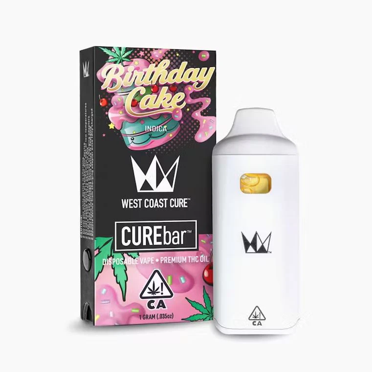 West Coast Cure's Disposable Vape CUREBar in the Birthday Cake flavor offers a delightful blend of physical relief and delectable taste. This Indica-dominant oil delivers a creamy vanilla flavor with subtle nutty undertones, making it a perfect way to end your day on a high note. The Birthday Cake CUREBar is designed to make any special occasion just a bit sweeter, providing a natural and enjoyable experience. Ideal for those seeking relaxation and a touch of indulgence, this 1g cartridge from West Coast Cure combines quality and flavor in one convenient package.