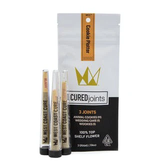 West Coast Cure - Pre Roll Pack - Indica/Hybrid - Cookie Platter (3g total) 3 Pack is a premium selection of three expertly crafted prerolls from West Coast Cure. This Indica-leaning hybrid pack features a potent mix of Animal Cookies (Hybrid) with 30.3% THC, Wedding Cake (Indica) at 28.5% THC, and Wookies (Indica) boasting 29.6% THC. Each joint delivers the powerful sedating effects and euphoric head high synonymous with Cookies strains, making it perfect for unwinding after a long day or melting away stress and pain. These curated collections highlight some of the finest cannabis genetics available, ensuring an exceptional experience whether you're looking to fuel your creativity or simply relax. Each pack contains three 1-gram prerolls, totaling 3 grams of top-tier cannabis enjoyment.